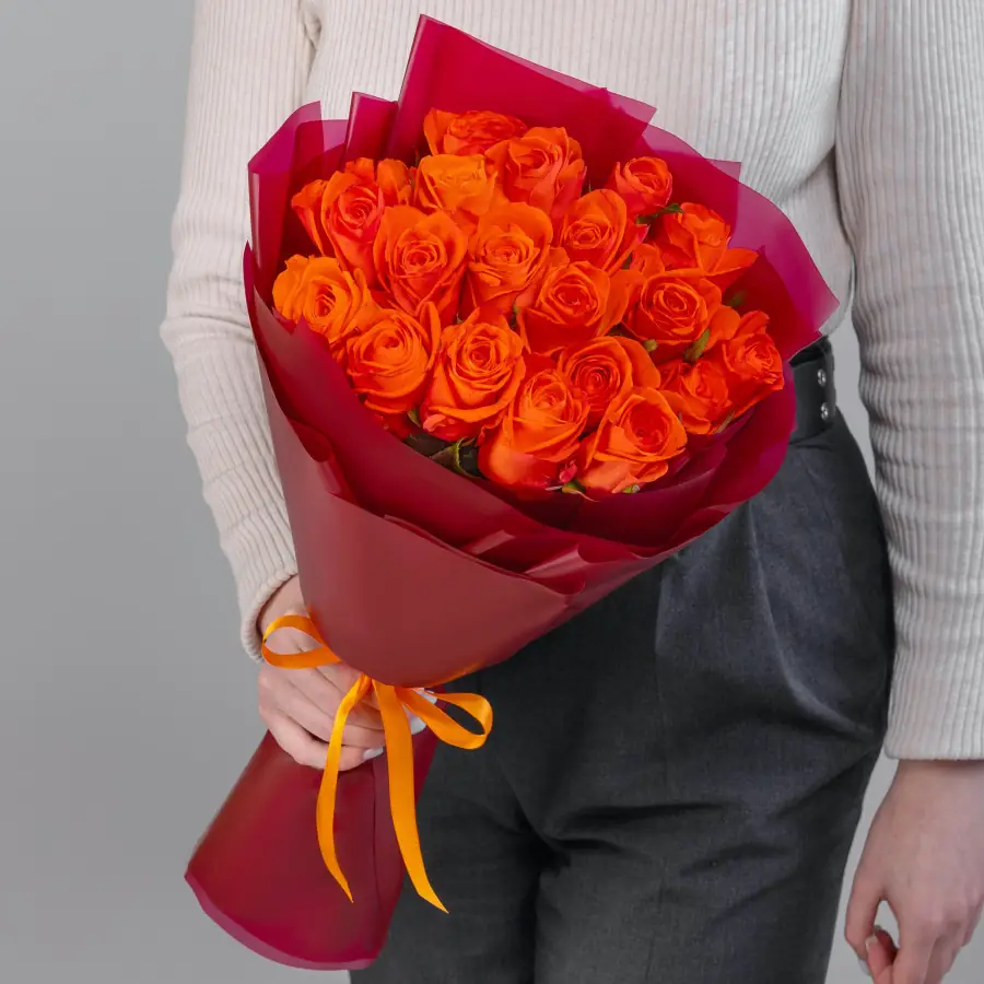 На фото - 19 Ярко-Оранжевых Роз. В составе данной композиции: Роза Кенийская - 19 шт,