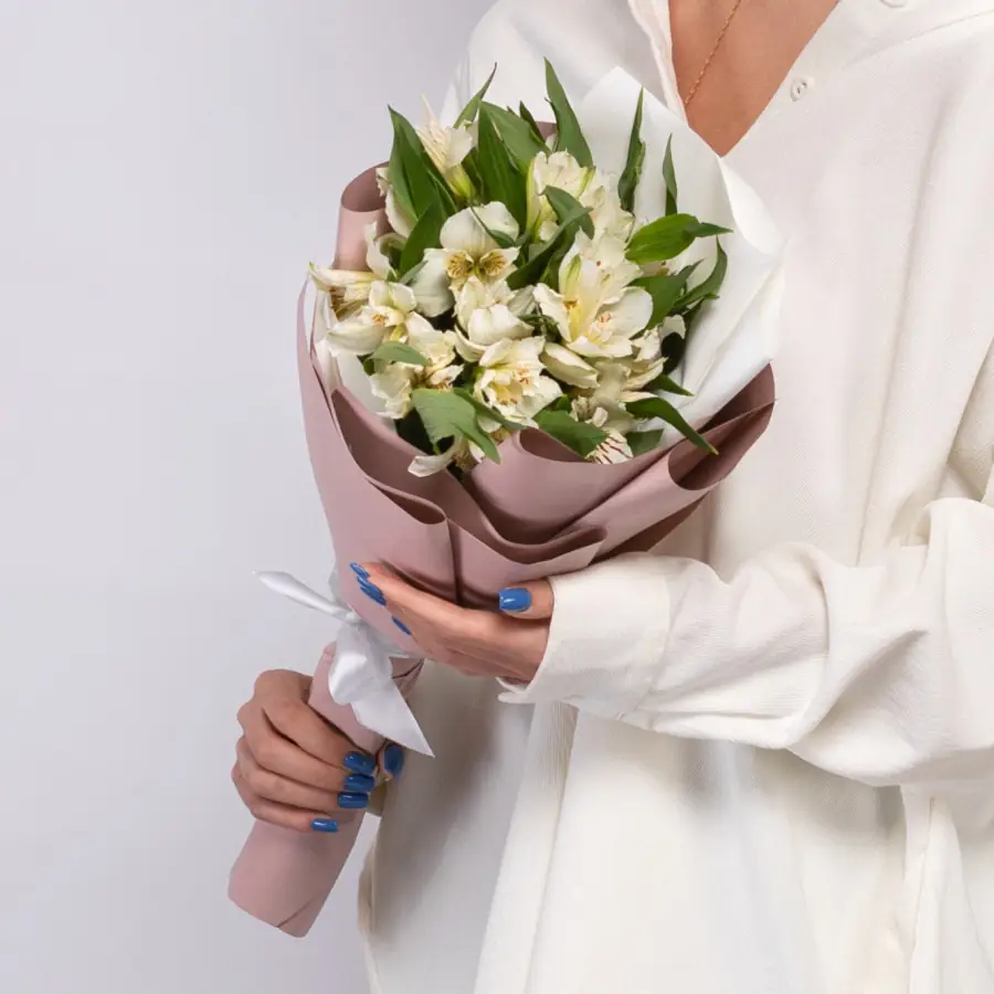 Альстромерии – эти удивительные цветы попали в Европу из Перу еще в восемнадцатом веке благодаря ботанику из Швеции графу Клаусу Альстромеру. Он первый привез несколько клубней на родину откуда и пошло победное шествие растения по всему миру. Иногда можно услышать еще два названия: Перуанская лилия или Лилия инков. У древнего народа цветы альстромерий считались даром богов и были частью различных священных обрядов, а прикасаться к ним могли только жрецы. Альстромерия больше всего похожа на орхидею: ее роднит с этими благородными цветами асимметричность лепестков, утонченная красота, яркие расцветки. Хотя на языке цветов Лилия инков значит поддержку, выражает дружбу, можно преподнести её в качестве благодарности, альстромерию белую так и хочется сделать свадебным букетом невесты, подарить возлюбленной. В вазе альстромерия белая стоит до двух недель, не имеет аромата – ее можно дарить аллергикам и чувствительным к запахам людям. Белоснежные соцветия, расположенные на длинном стебле в количестве 5-8 штук, с характерными темными чёрточками на лепестках не оставят равнодушным одариваемого человека. Наш онлайн гипермаркет База Цветов предлагает купить 5 белых альстромерий оформленных в дизайнерскую упаковку с доставкой по Дзержинску и области.