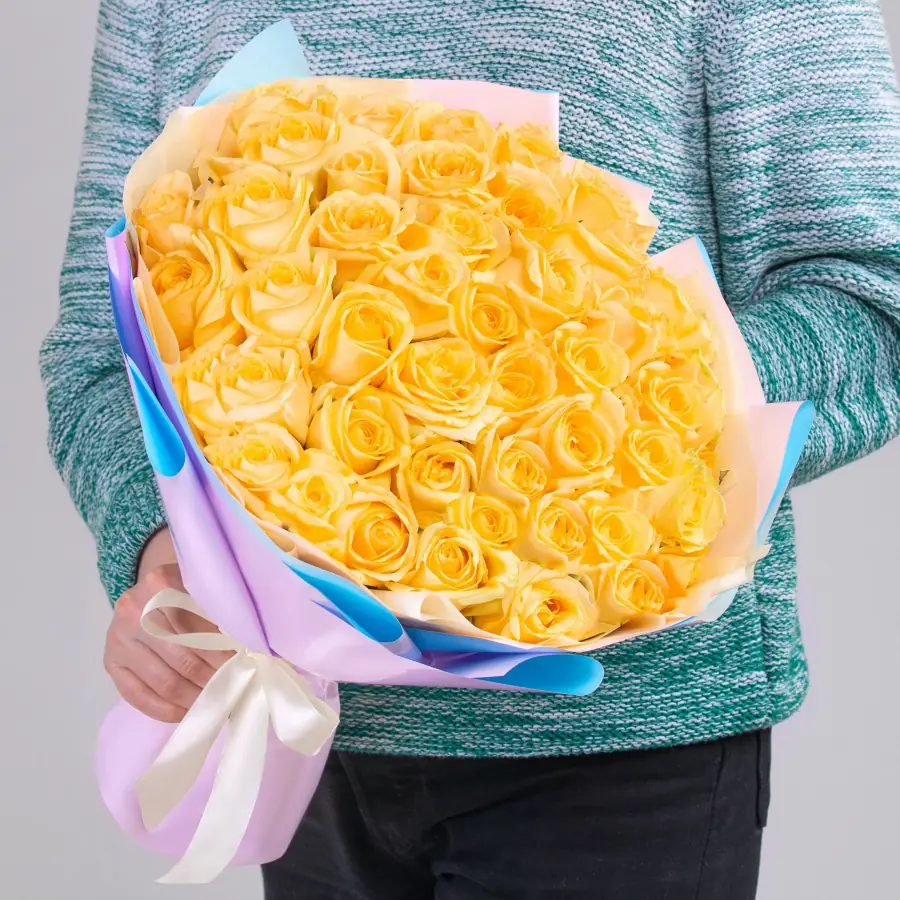 Букет составляется непосредственно в день доставки из свежих цветов, а затем с приятной улыбкой вручается адресату.