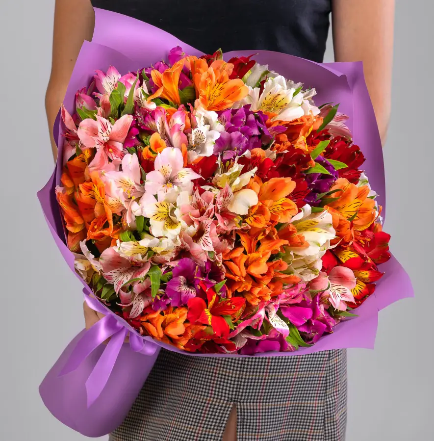 На фото - 35 Альстромерий Микс в упаковке . В составе данной композиции: Альстромерия - 35 шт, Дизайнерская упаковка, Лента атласная , . На сайте buket-dzr.ru Вы найдете большой выбор недорогих букетов, цветочных композиций для любого повода. У нас можно заказать 35 Альстромерий Микс в упаковке за 8300 руб.