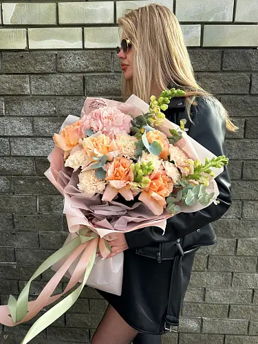 Букет составляется непосредственно в день доставки из свежих цветов, а затем с приятной улыбкой вручается адресату.