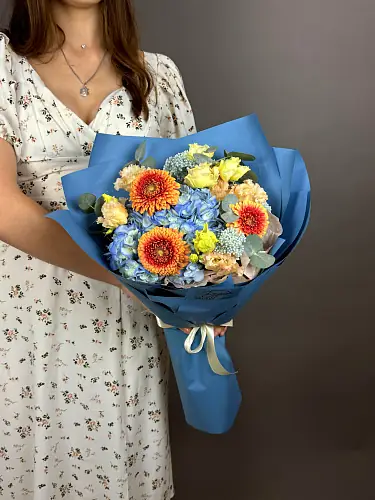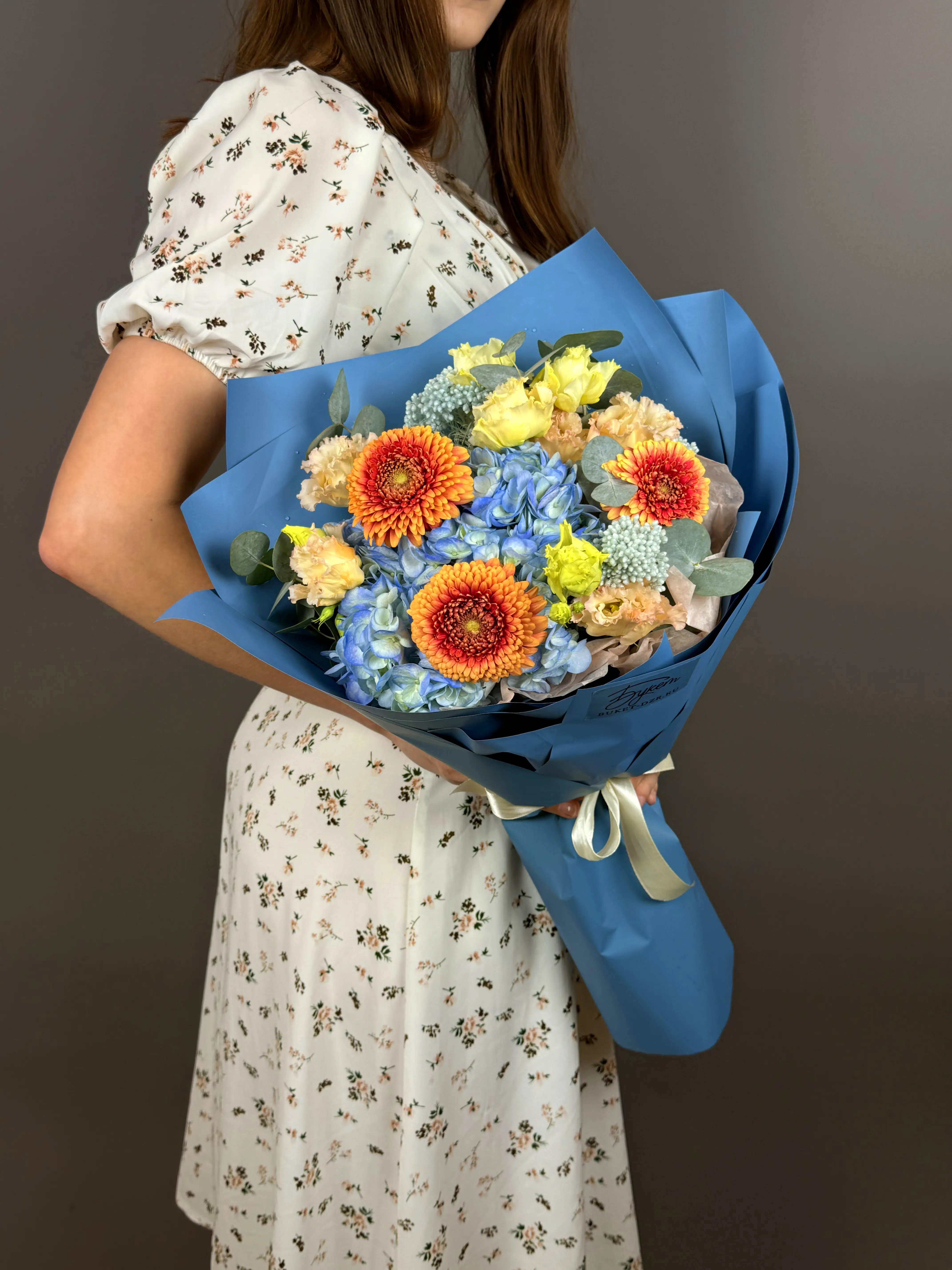 Букет с голубой гортензией и герберой мини — купить по цене от 4030 руб. с доставкой в Дзержинске