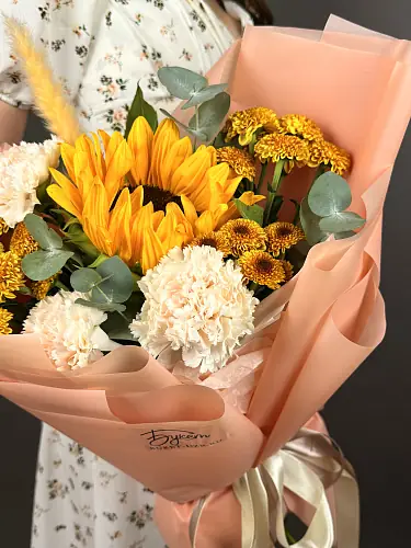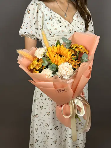 Солнечный букет с подсолнухом и диантусами