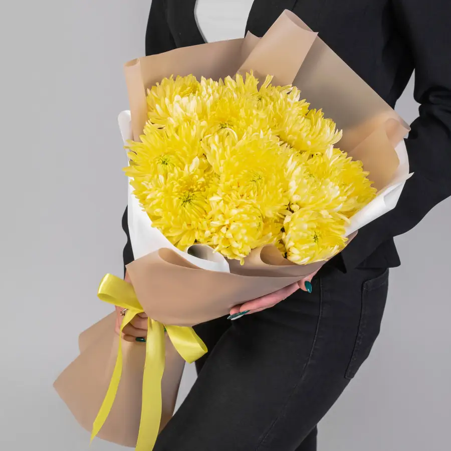 11 Желтых Игольчатых Хризантем в упаковке - пример оформления на фото. Состоит из: Хризантема одноголовая - 11 шт,