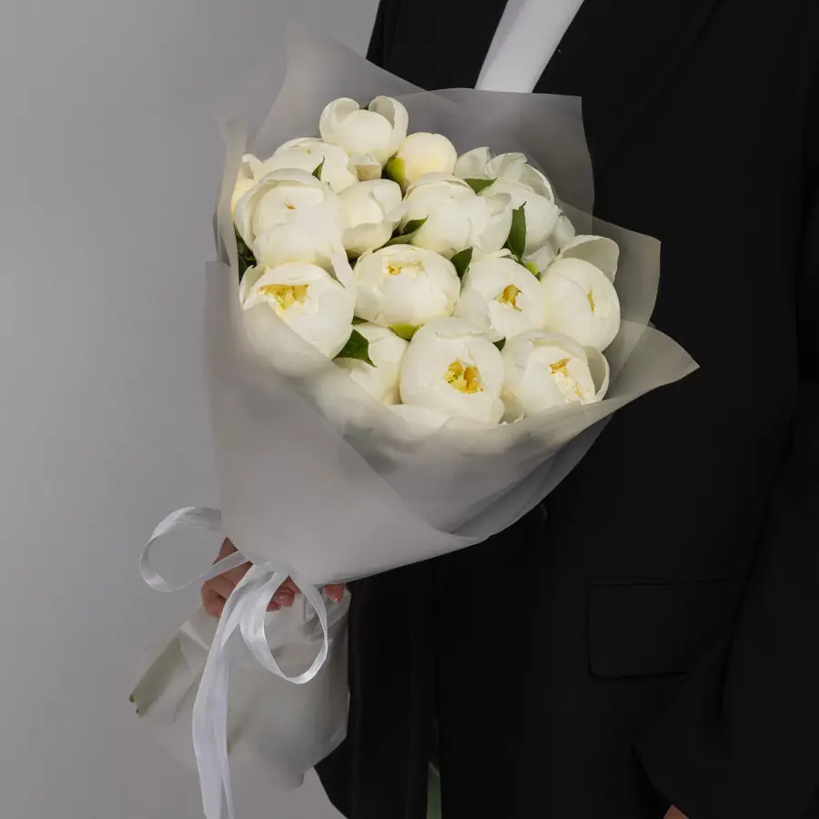 15 Белых Пионов - пример оформления на фото. Состоит из: Пион - 15 шт,
