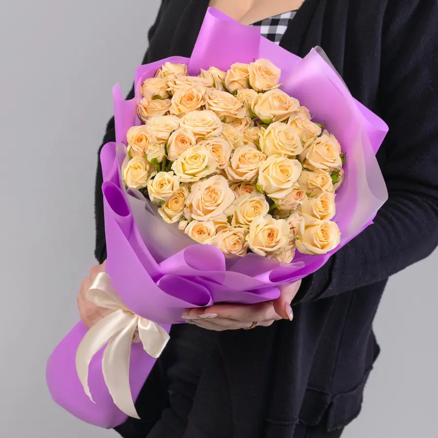 15 бежевых роз в упаковке - пример оформления на фото. Состоит из: Роза Кустовая - 15 шт,