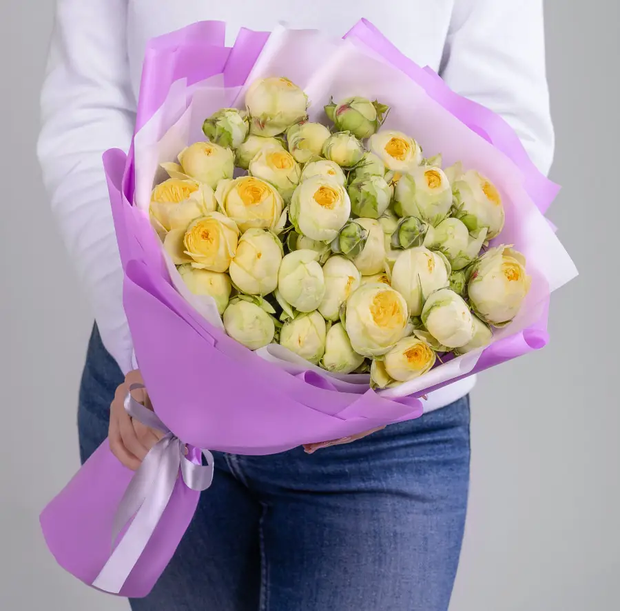15 Кустовых Пионовидных Желтых Роз - пример оформления на фото. Состоит из: Роза кустовая пионовидная - 15 шт,