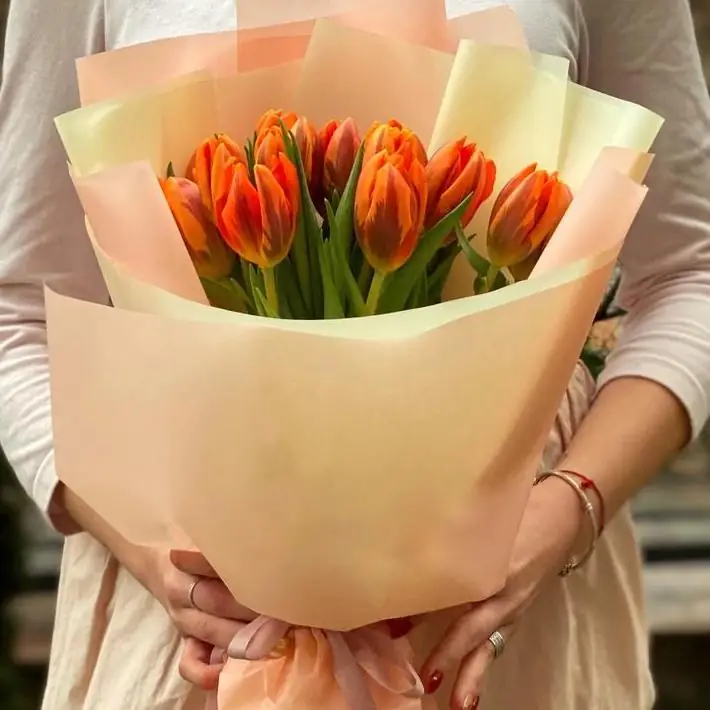 Букет 15 Оранжевых Тюльпанов - пример оформления на фото. Состоит из: Тюльпан Оранжевый - 15 шт.,