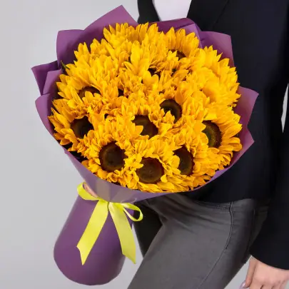 Яркие Подсолнухи в упаковке 15 шт - пример оформления на фото. Состоит из: Подсолнух - 15 шт,