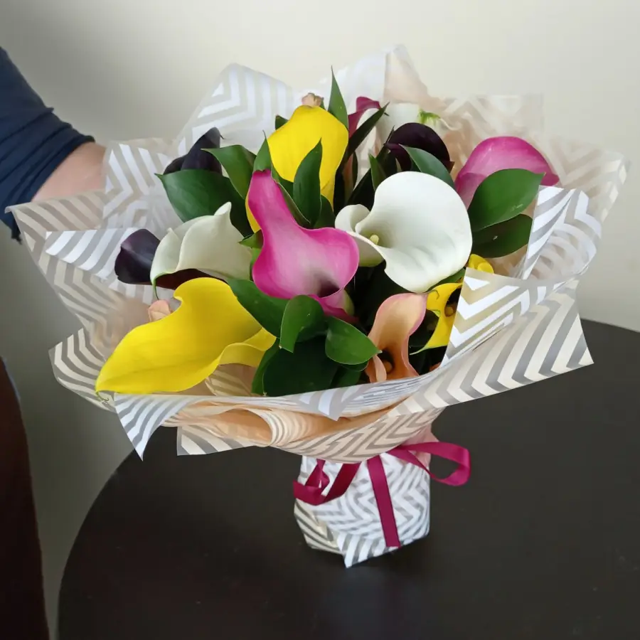 15 Разноцветных Калл - пример оформления на фото. Состоит из: Калла Микс - 15 шт.,