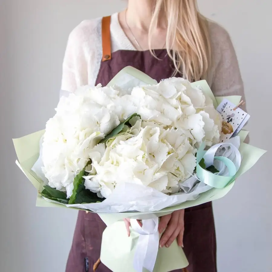 3 Снежные Гортензии - пример оформления на фото. Состоит из: Гортензия - 3 шт,