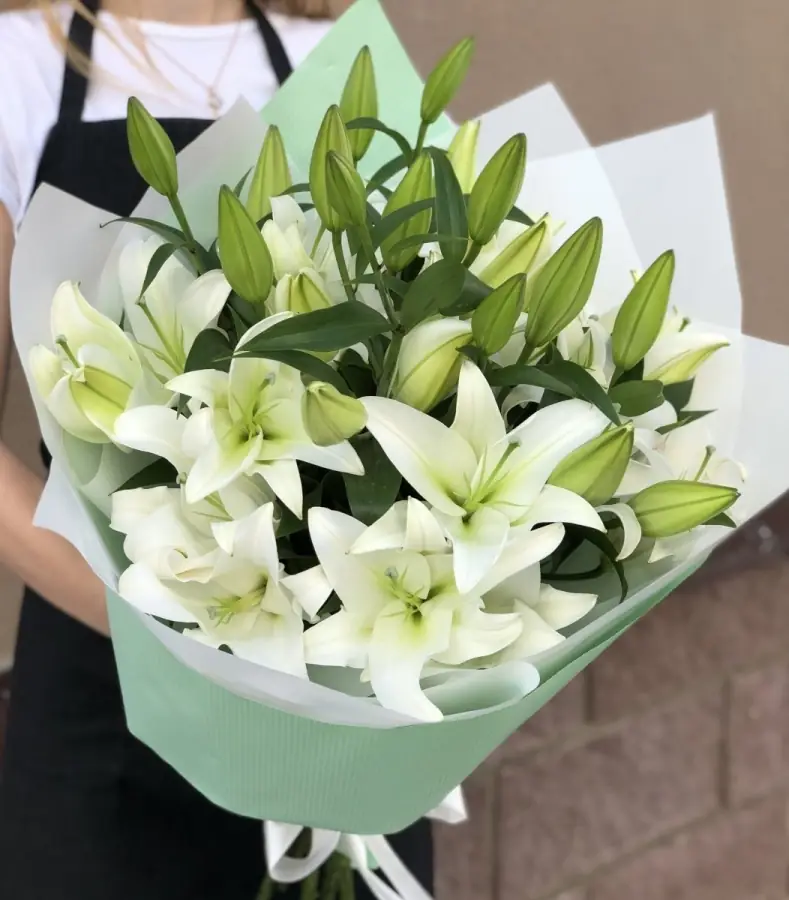 5 Белых Восточных Лилий в упаковке - пример оформления на фото. Состоит из: Лилия Восточная - 5 шт. ,