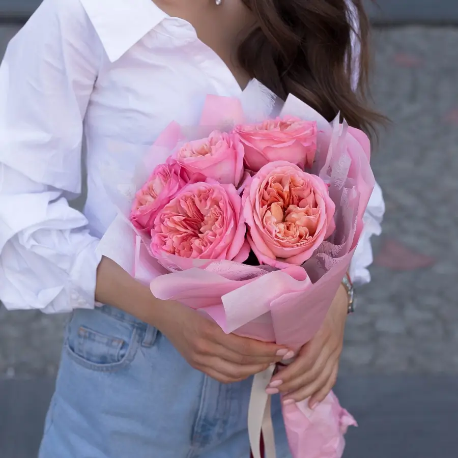 Яркие пионовидные розы - пример оформления на фото. Состоит из: Роза розовая пионовидная - 5 шт,