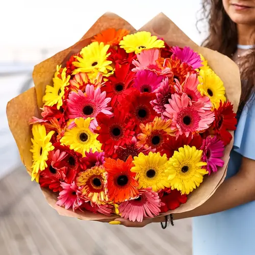 51 Разноцветная Гербера в крафте - пример оформления на фото. Состоит из: Гербера Микс - 51 шт.,