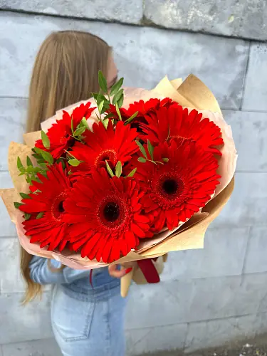 7 Красных гербер с зеленью - пример оформления на фото. Состоит из: Гербера - 7 шт,