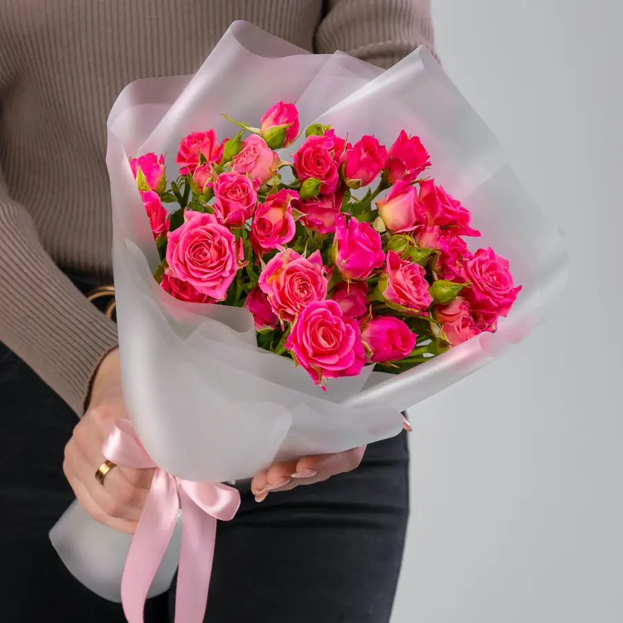 Букет из 7 Малиновых Роз в упаковке - пример оформления на фото. Состоит из: Кустовые розы - 7 шт,