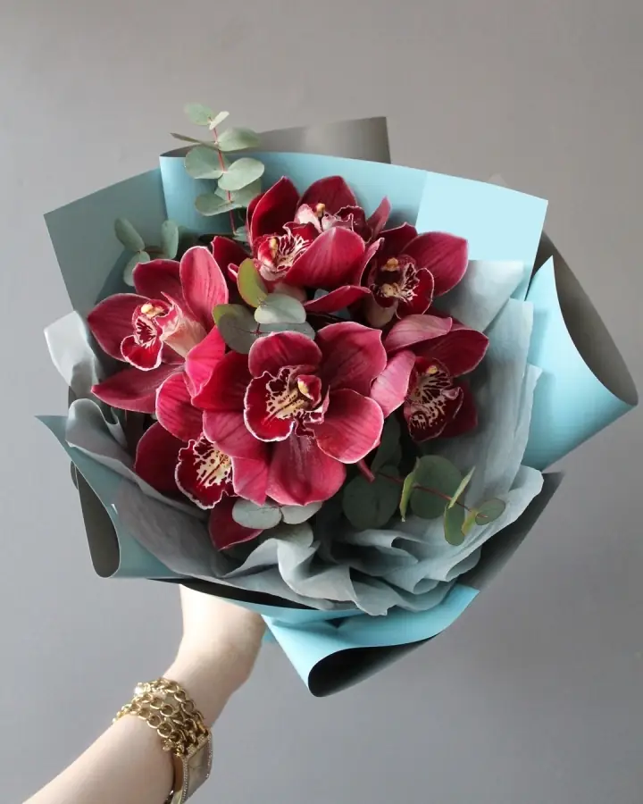 7 Малиновых Орхидей - пример оформления на фото. Состоит из: Орхидея Цимбидиум Бордовая (1 цветок) - 7 шт.,