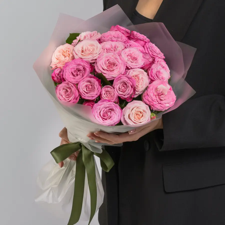 9 Кустовых Пионовидных Розовых Роз - пример оформления на фото. Состоит из: Роза кустовая пионовидная - 9 шт,