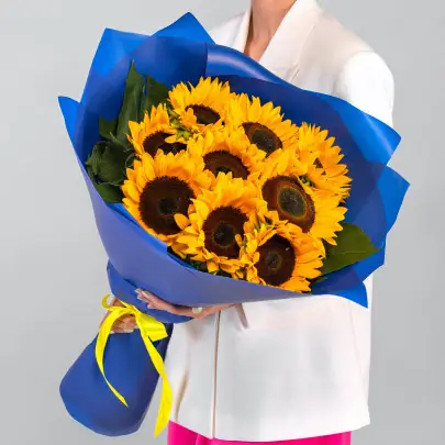 9 Подсолнухов в упаковке - пример оформления на фото. Состоит из: Подсолнухов - 9 шт,