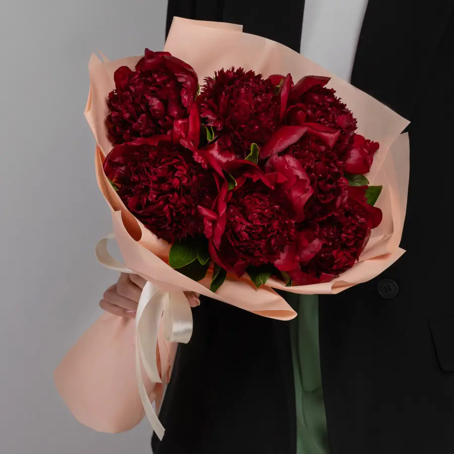 Авторский букет из 7 Красных Пионов - пример оформления на фото. Состоит из: Пион Красный - 7 шт.,