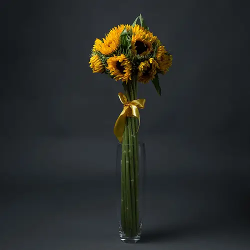 15 Подсолнухов - пример оформления на фото. Состоит из: Подсолнух Желтый - 15 шт., Лента атласная, . Собираем только из свежих цветов, после сборки пришлем Вам фото. Доставим по г. Дзержинску и Нижегородской области, стоимость - 5450 руб..