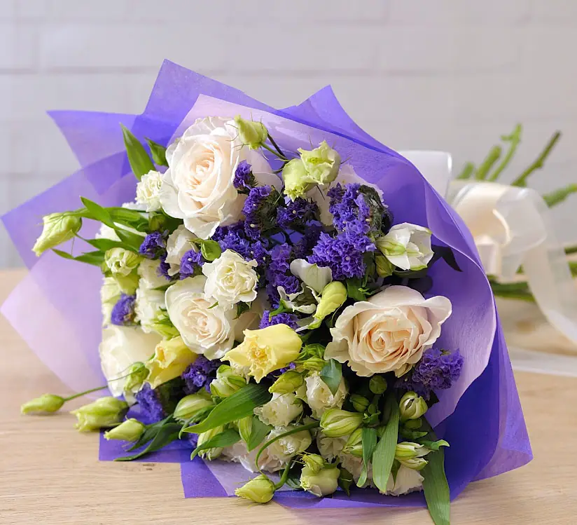 Белые эквадорские розы в сочетании с фиолетовыми веточками статицы делают букет композицией для выражения благородных чувств и словно бы окунают в атмосферу Прованса с его романтикой и лавандовыми полями. Здесь нет страсти, нет агрессии, и поэтому композиция станет прекрасным дополнением любого праздника.