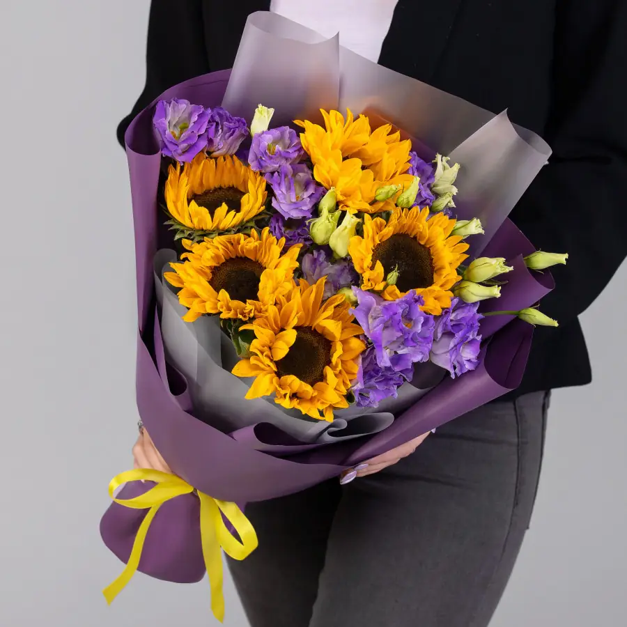 Букет эустомой и подсолнухами - пример оформления на фото. Состоит из: Подсолнух - 5 шт,