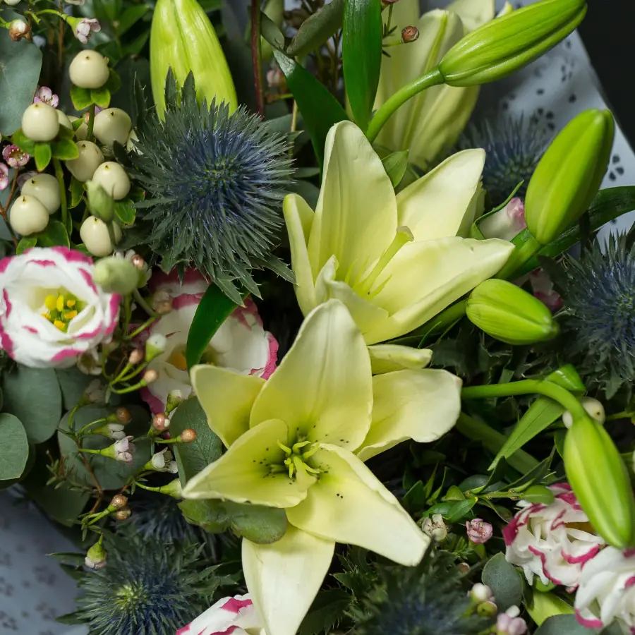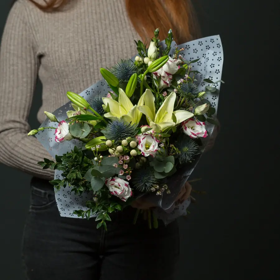 Букет "Голубая Жемчужина" - пример оформления на фото. Состоит из: Эустома Бело-Розовая - 5 шт.,
