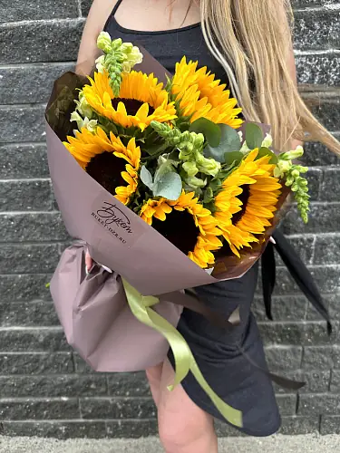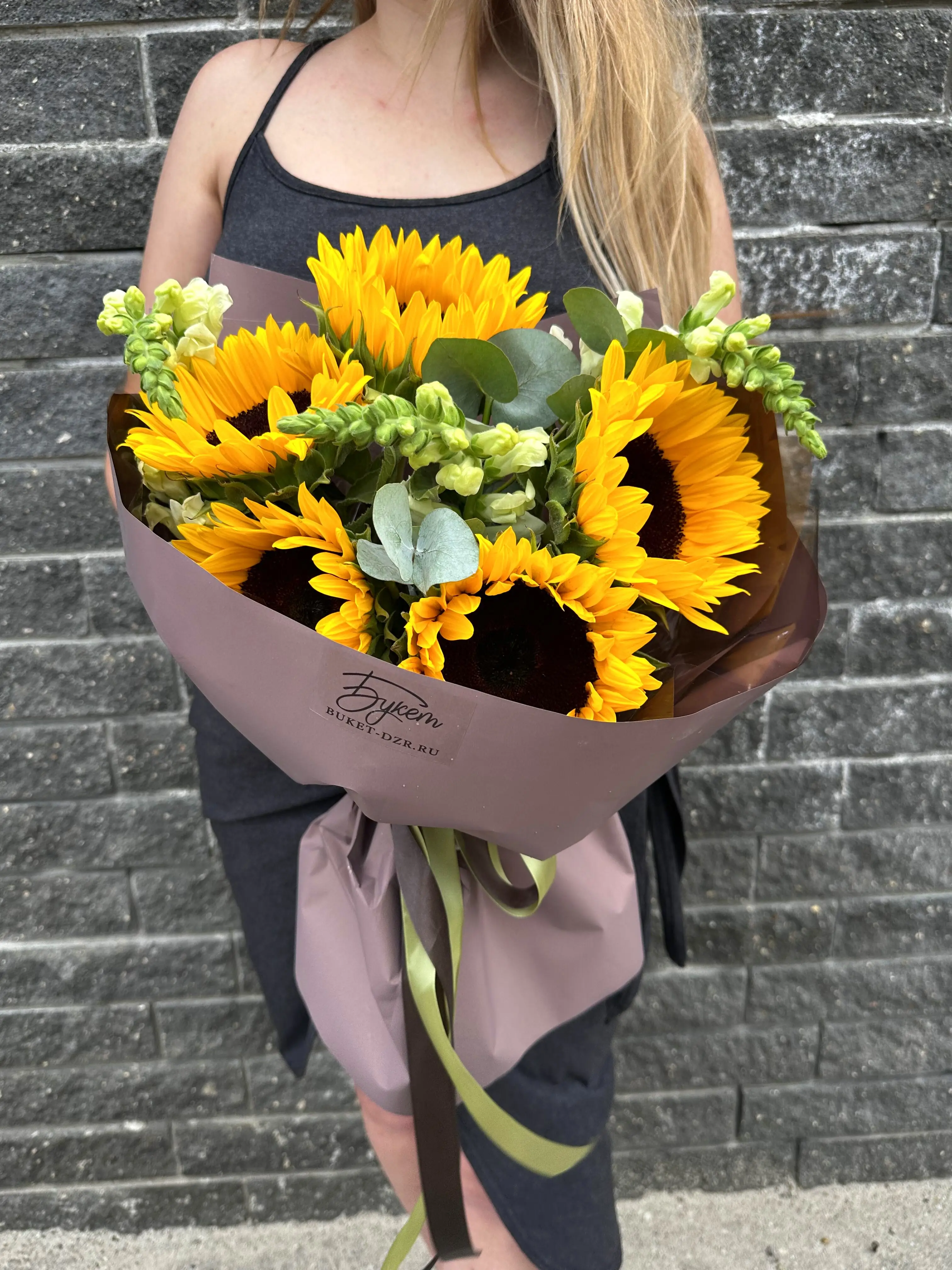 5 подсолнухов и зелень - пример оформления на фото. Состоит из: Подсолнух - 5 шт,