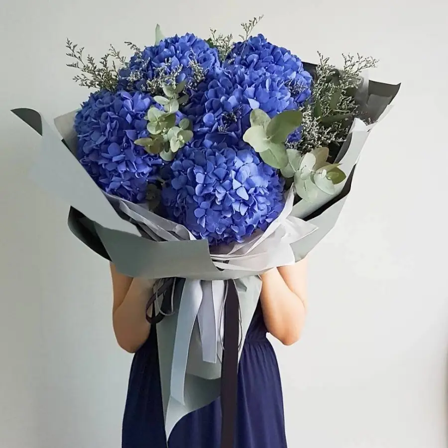 5 синих гортензий с эвкалиптом - пример оформления на фото. Состоит из: Гортензия - 5 шт,