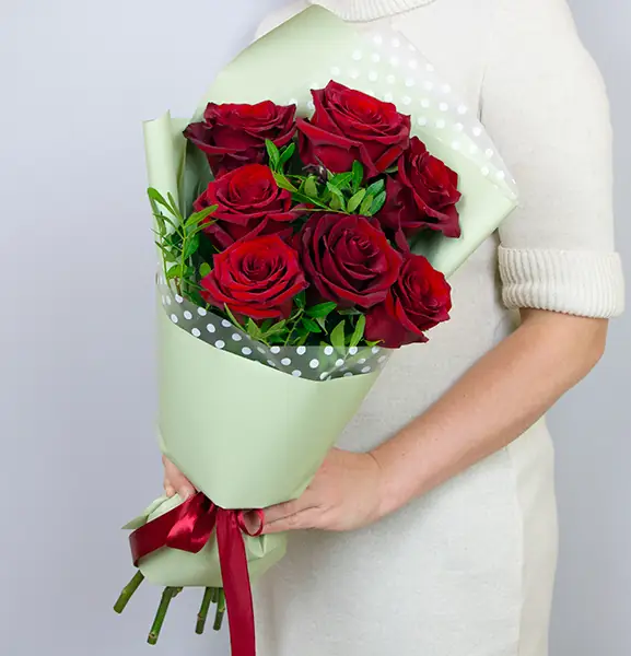 7 Элитных Бордовых роз (Эквадор) в зеленой упаковке - пример оформления на фото. Состоит из: Роза - 7 шт.,