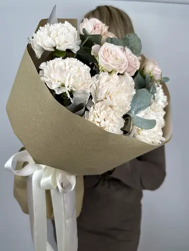 Букет из диантуса и кустовой розы - пример оформления на фото. Состоит из: Диантус - 7 шт,