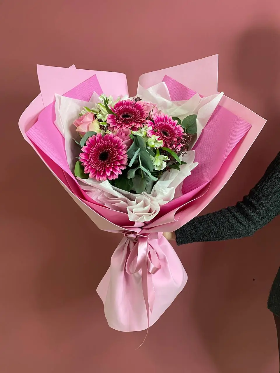 Букет из гербер и альстромерии - пример оформления на фото. Состоит из: Гербера - 3 шт.,