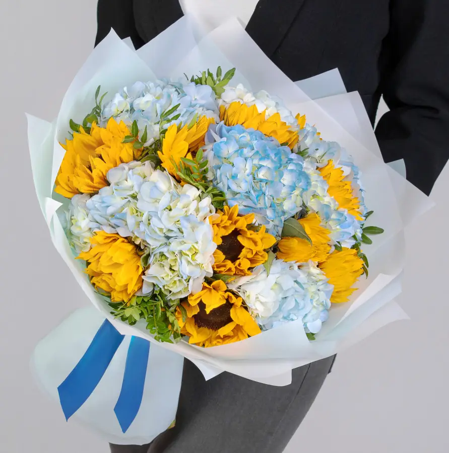 Букет Гортензии и подсолнухи - пример оформления на фото. Состоит из: Гортензия- 6 шт,