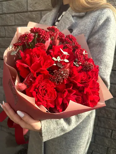 Букет из красных роз и хризантем - пример оформления на фото. Состоит из: Красная Роза Кениийская - 7 шт,