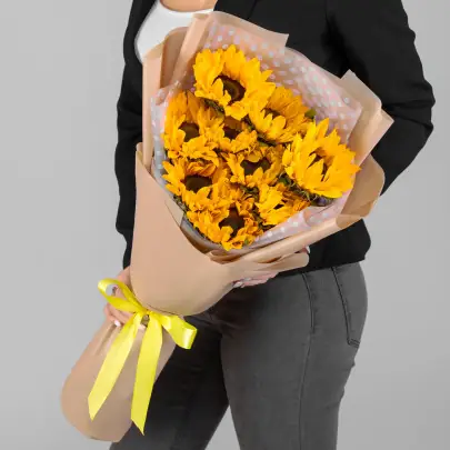 Букет из подсолнухов 9 шт - пример оформления на фото. Состоит из: Подсолнух - 9 шт,