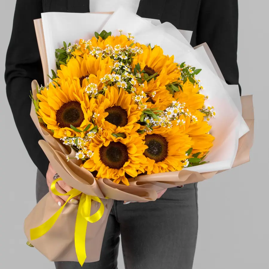 Подсолнухи и матрикария - пример оформления на фото. Состоит из: Подсолнух - 10 шт,