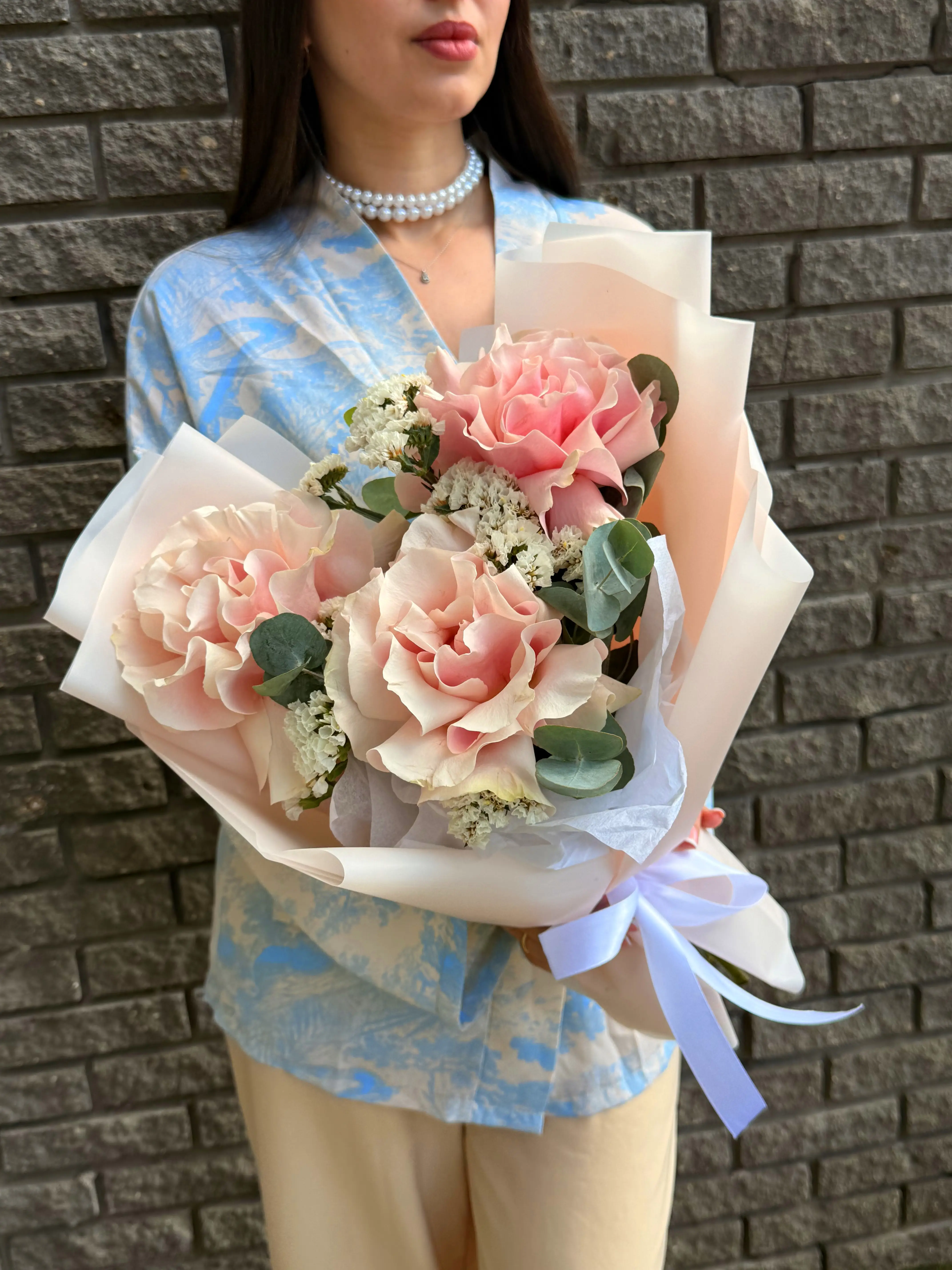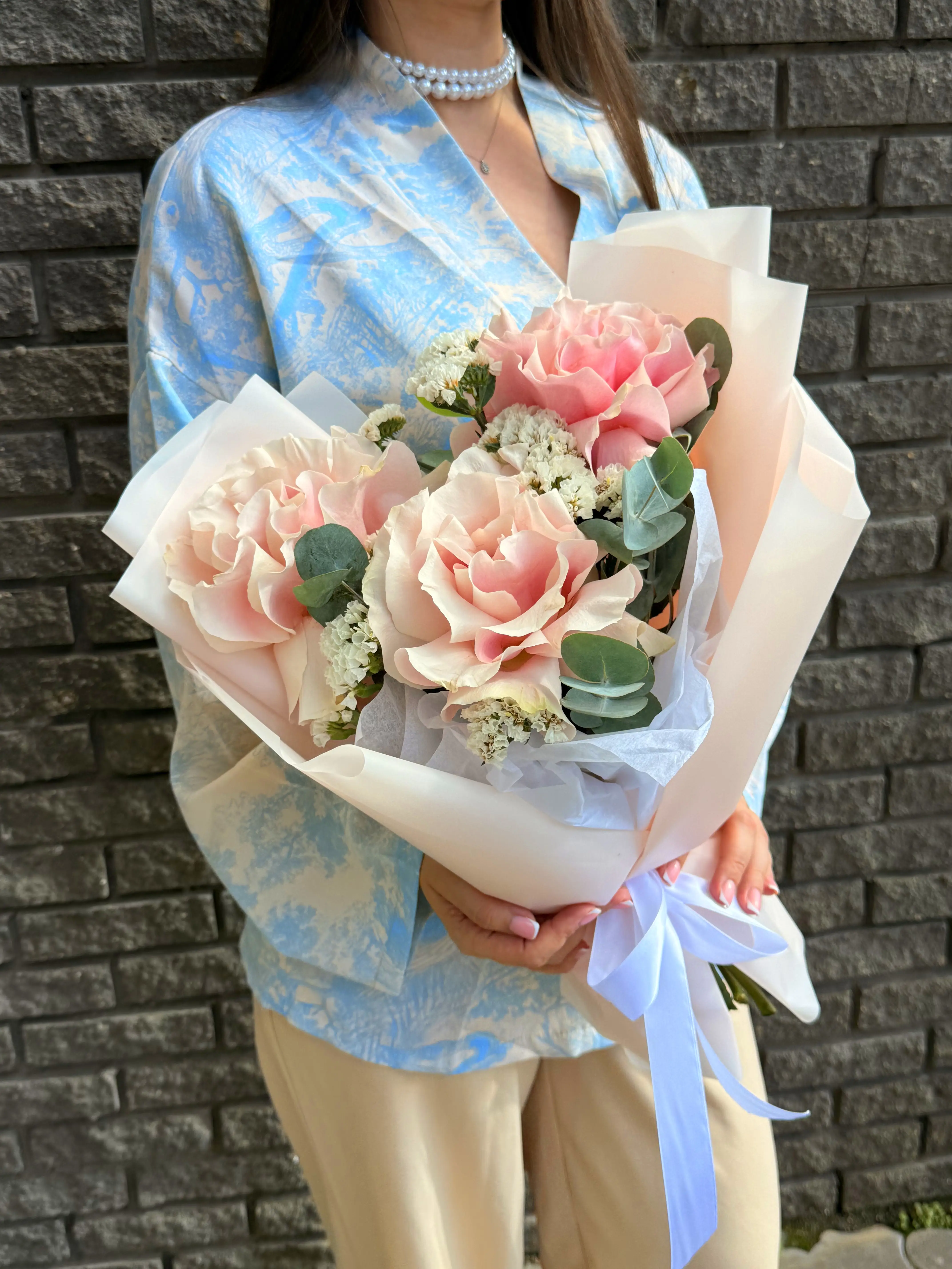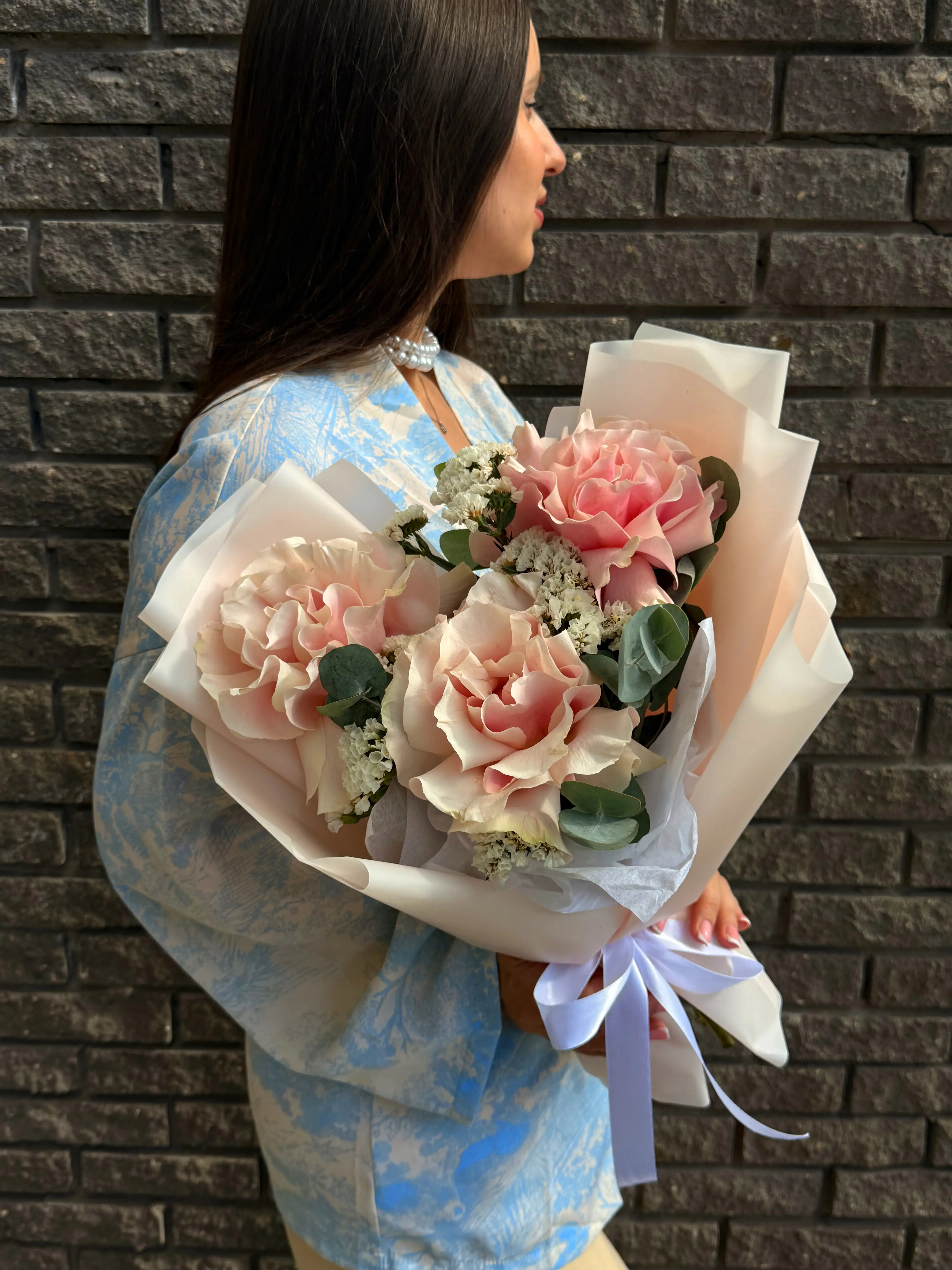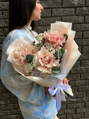 Букет из роз и статицы в стильной упаковке - пример оформления на фото. Состоит из: Роза Эквадор - 3 шт,