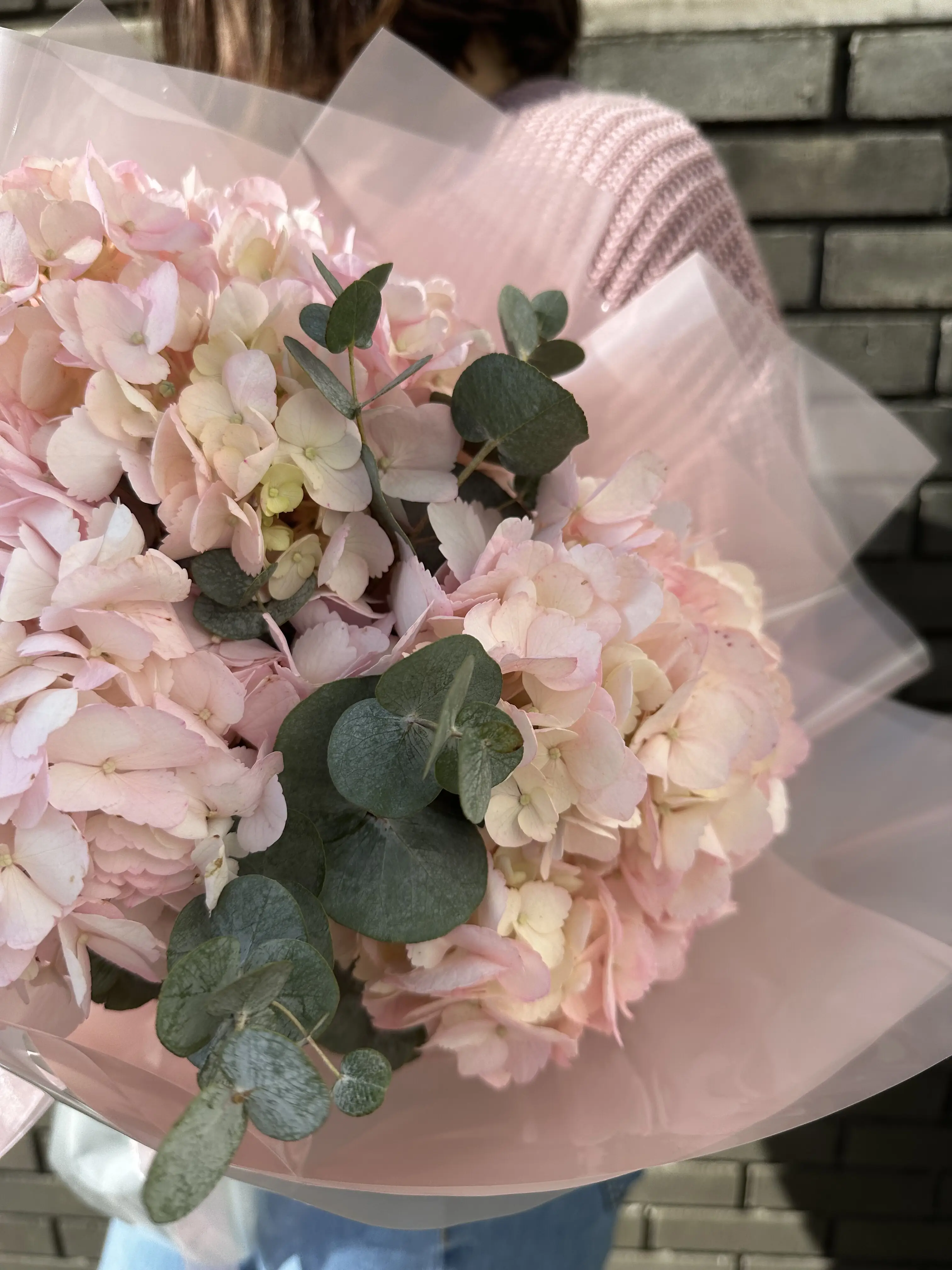 Розовые гортензии с Зеленью - пример оформления на фото. Состоит из: Гортензия - 3 шт,