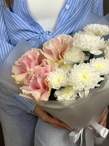 Букет из розовых роз и кустовой хризантемы - пример оформления на фото. Состоит из: Роза Эквадор - 3 шт,