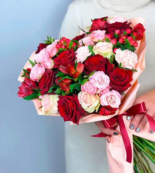 Букет из красных и розовых эквадорских роз и кустовых пионовидных - самое красивое признание в Ваших чувствах Королеве!