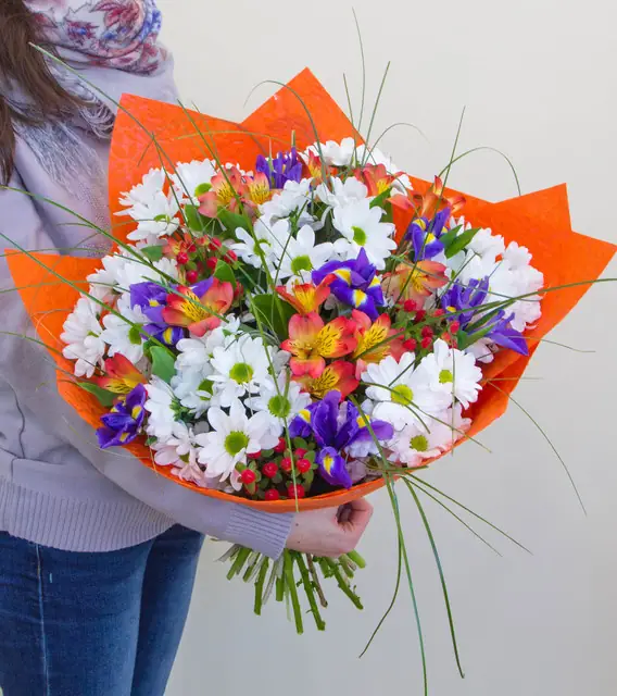 Альстромерии и хризантемы в упаковке - пример оформления на фото. Состоит из: Ирис - 7 шт.,