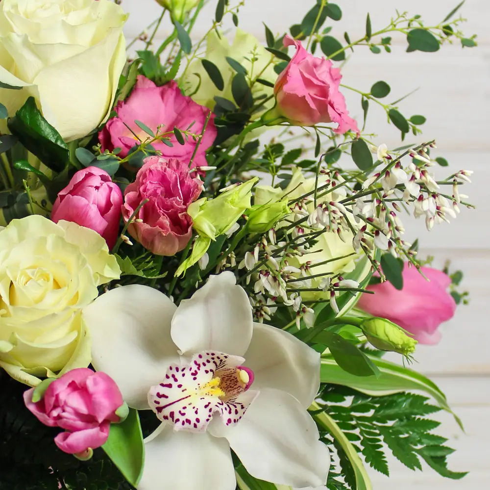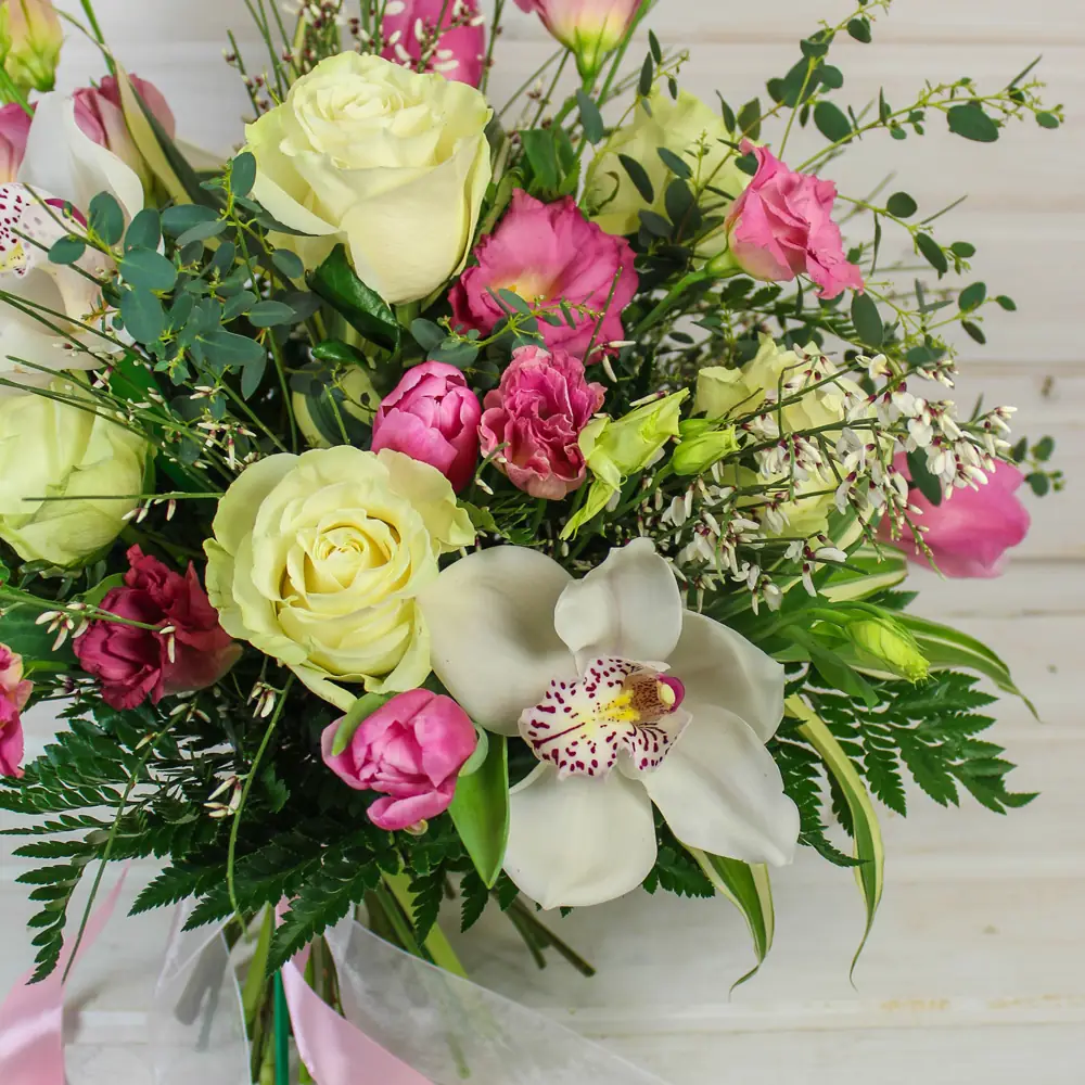 Если у Вас есть любимая подружка и хочется ее поздравить с днем рождения, или просто поднять настроение, послав цветочный презент, то этот нежный, милый букетик в бело-розовой гамме как раз подойдет. Впрочем, не будем Вас ограничивать :) На самом деле, букет создан в довольно универсальной цветовой гамме и такой композиции, несомненно, будет рада и супруга, и дочь, и мама, и коллега.