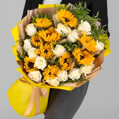 Букет "Подсолнухи и Белые Розы" - пример оформления на фото. Состоит из: Подсолнух - 9 шт,
