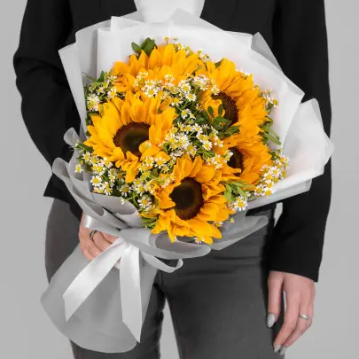 Букет из Ромашек и Подсолнухов - пример оформления на фото. Состоит из: Подсолнух- 5 шт,