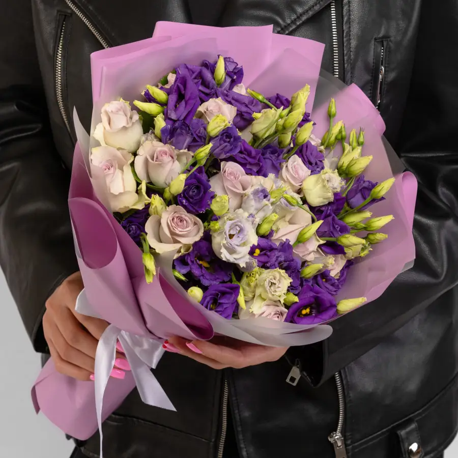 Букет "Роза и Эустома" - пример оформления на фото. Состоит из: Эустома Фиолетовая - 10 шт.,