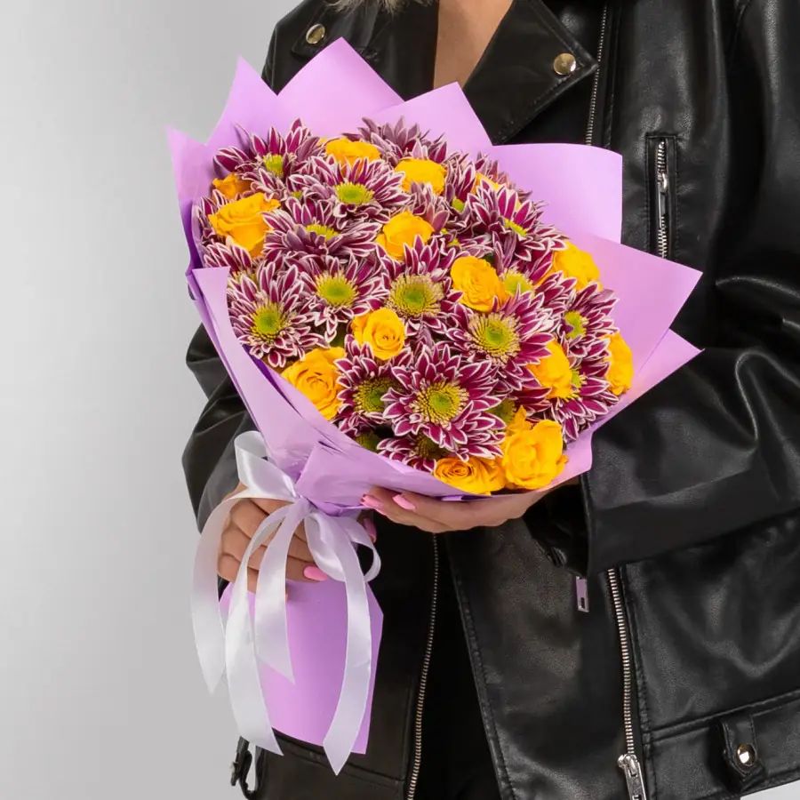 Букет "Роза и Хризантема" - пример оформления на фото. Состоит из: Хризантема Кустовая - 9 шт.,