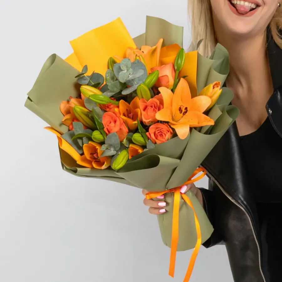 Букет "Роза и Лилии" мини - пример оформления на фото. Состоит из: Лилия Оранжевая - 4 шт.,