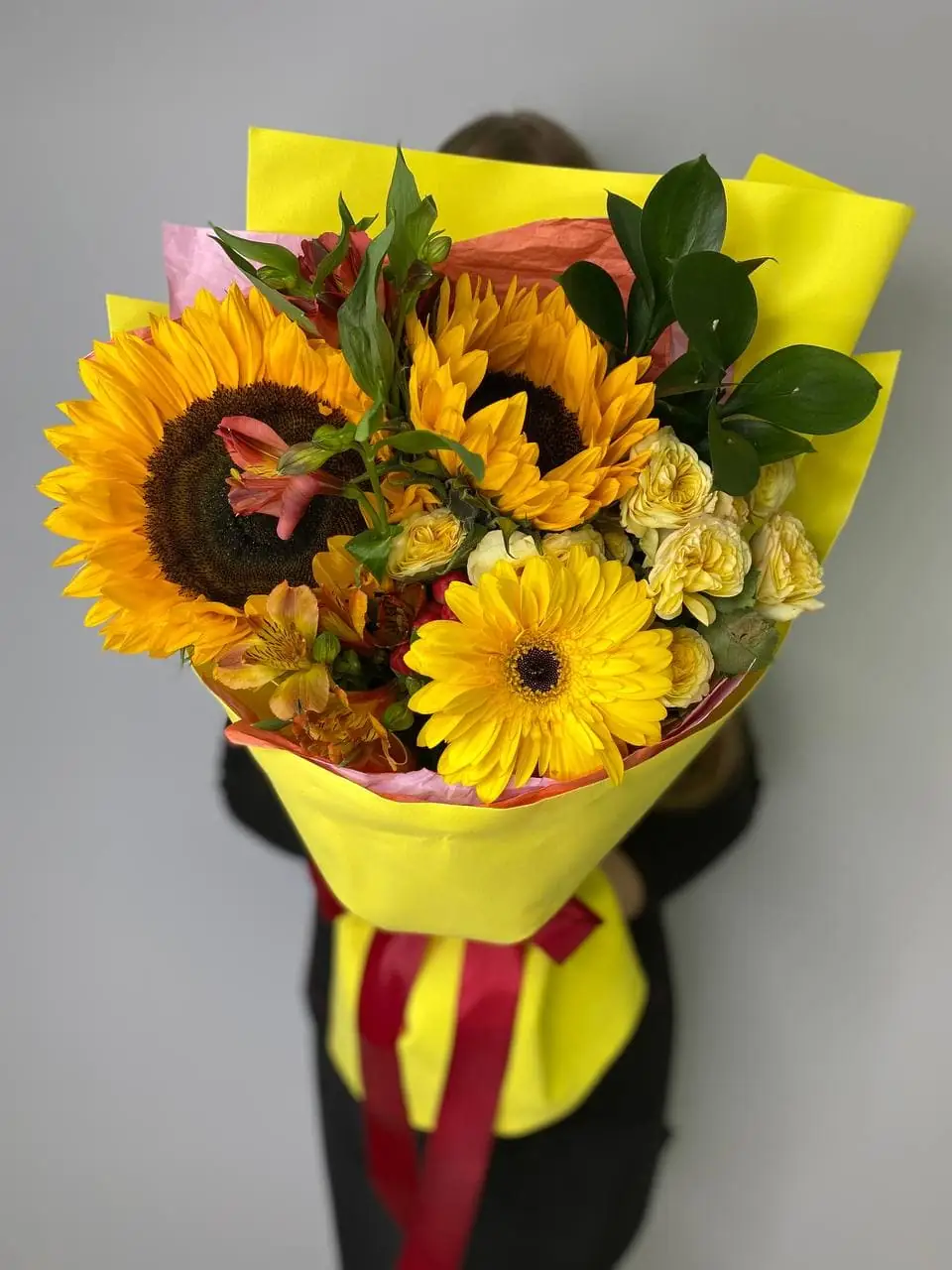 Букет с герберой ,подсолнухами и розами - пример оформления на фото. Состоит из: Подсолнух - 2 шт.,