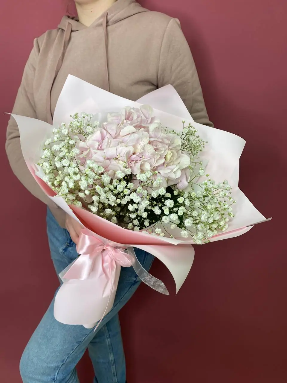 Букет с гортензией и гипсофилой - пример оформления на фото. Состоит из: Гортензия - 1 шт.,